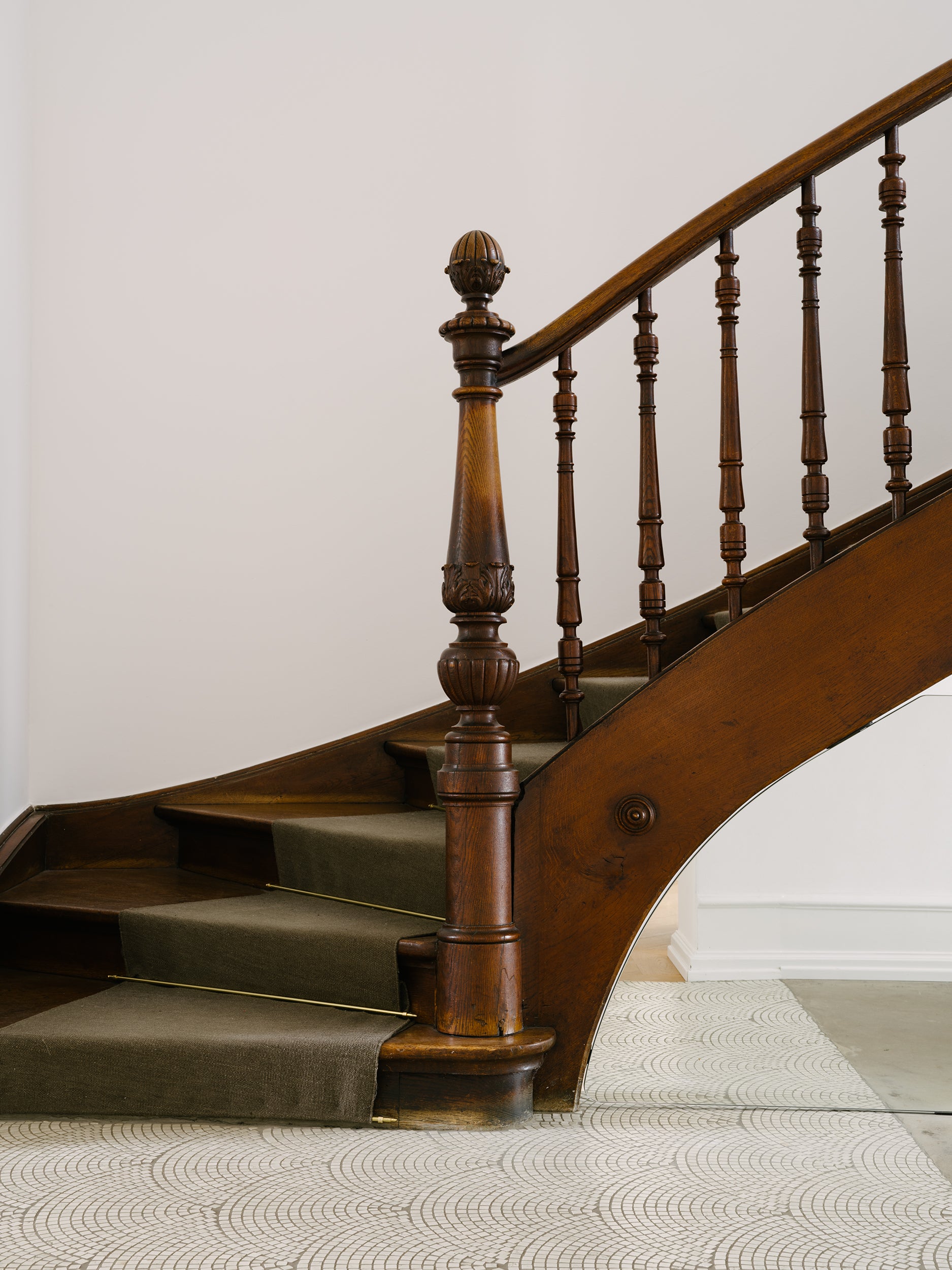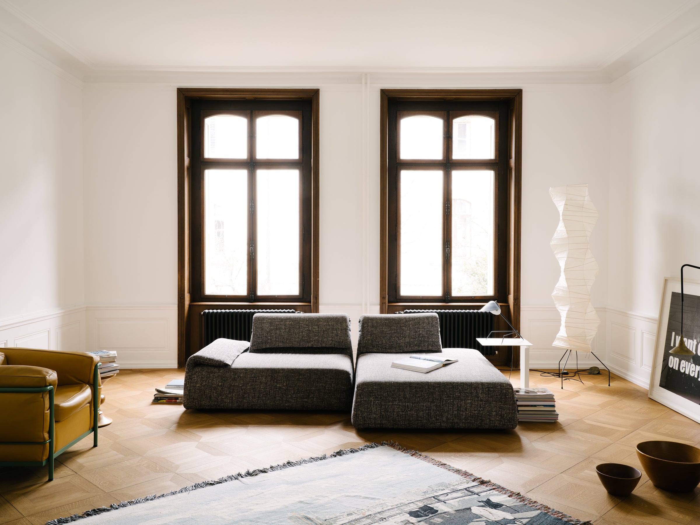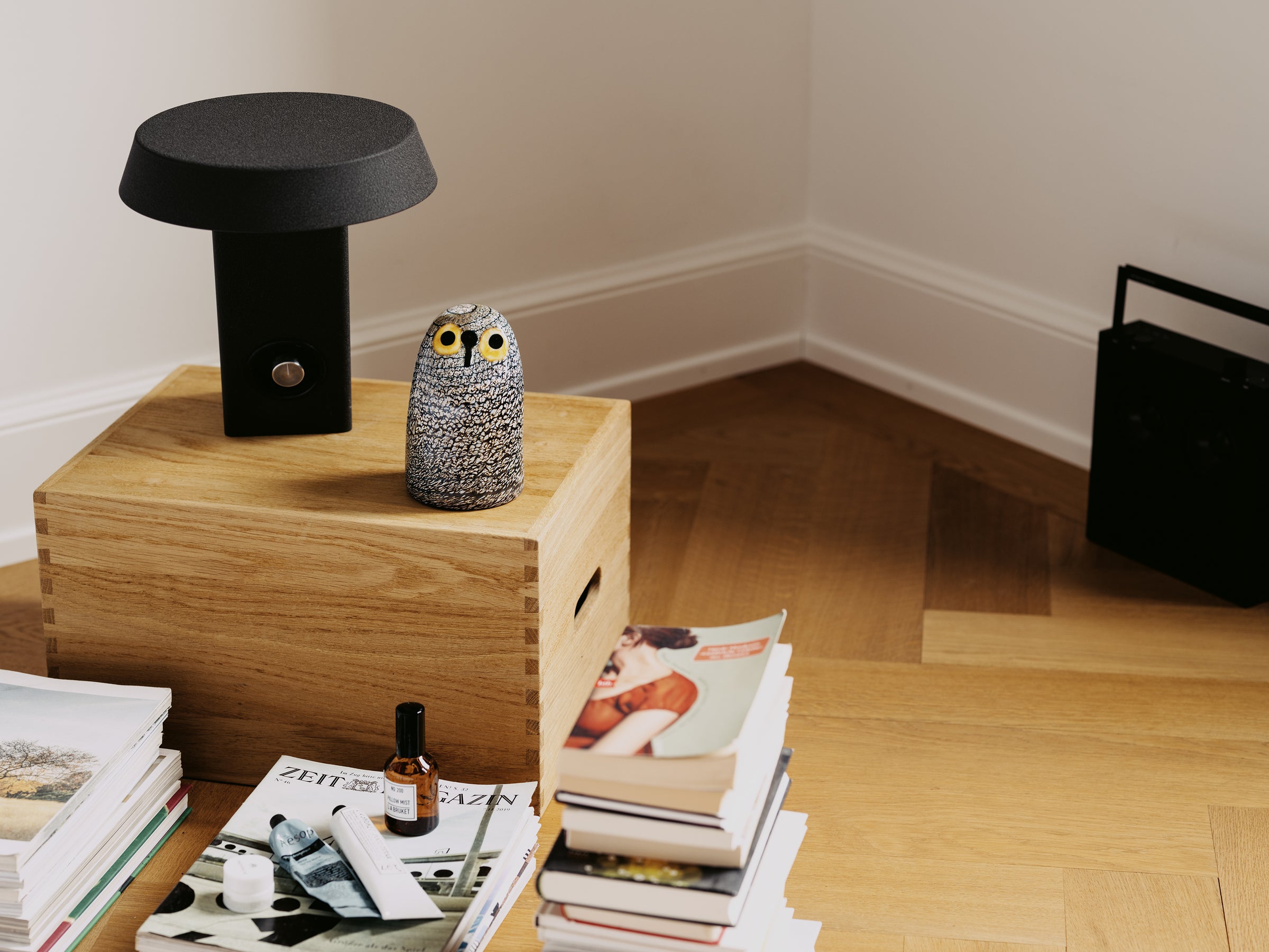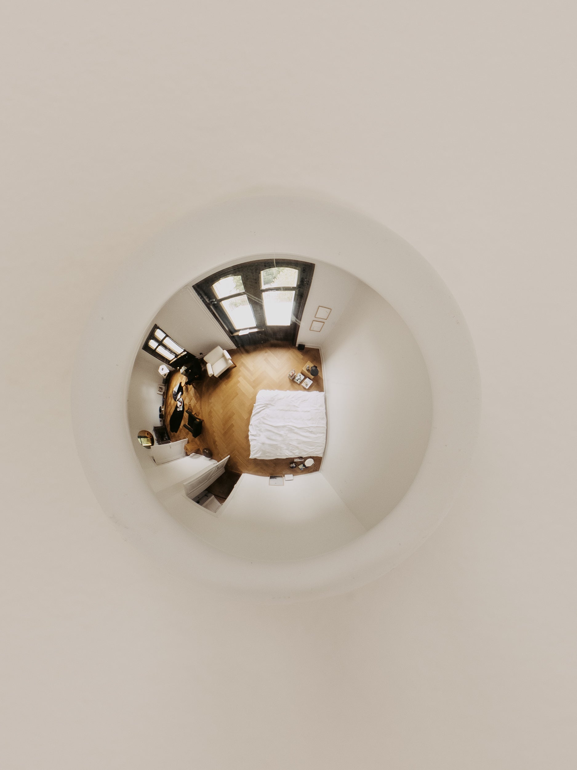 – I don’t like the idea of a classical bedroom. That’s why our bedroom is also a study and a private living room. It is a place to listen to records, enjoy the fire in the open fireplace or watch a movie that we project onto the wall in the evenings. It is a large and open, almost loft-like space. We sleep on a Japanese futon on the floor surrounded by books and magazines. The windows look out onto the top of the trees in our garden. We don’t have curtains or a blackout. I like that shadows, light and reflections are constantly changing depending on the time of the day, weather or season. Above the bed I placed a simple half mirror bulb that reflects the entire room. It is nice that when you are in bed and look at the ceiling that you can see the space in its totality concentrated in this one spot. I like the play with precisely placed reflecting or mirroring surfaces throughout the house. If done subtly they allow you to perceive a space in so many more ways.