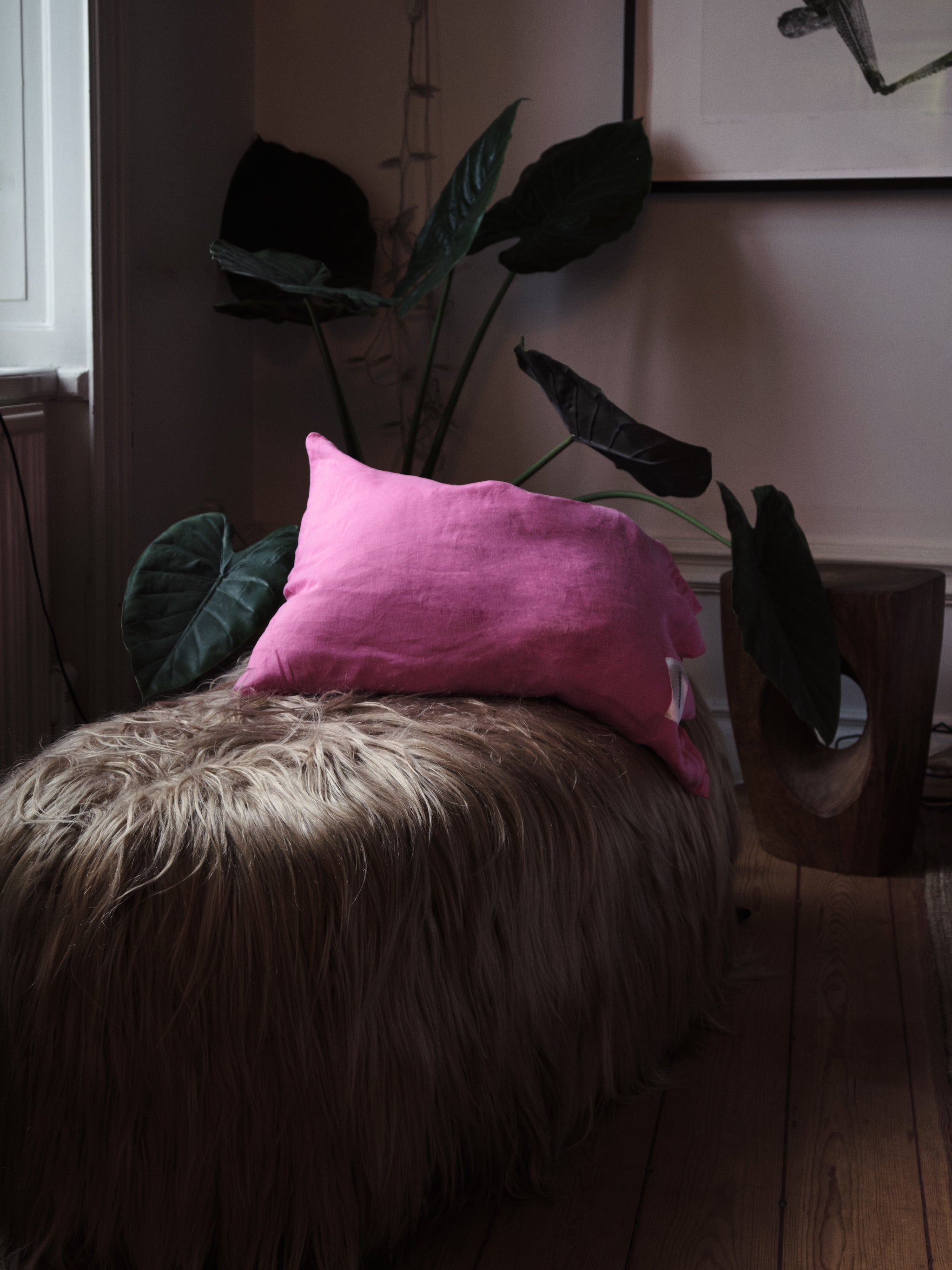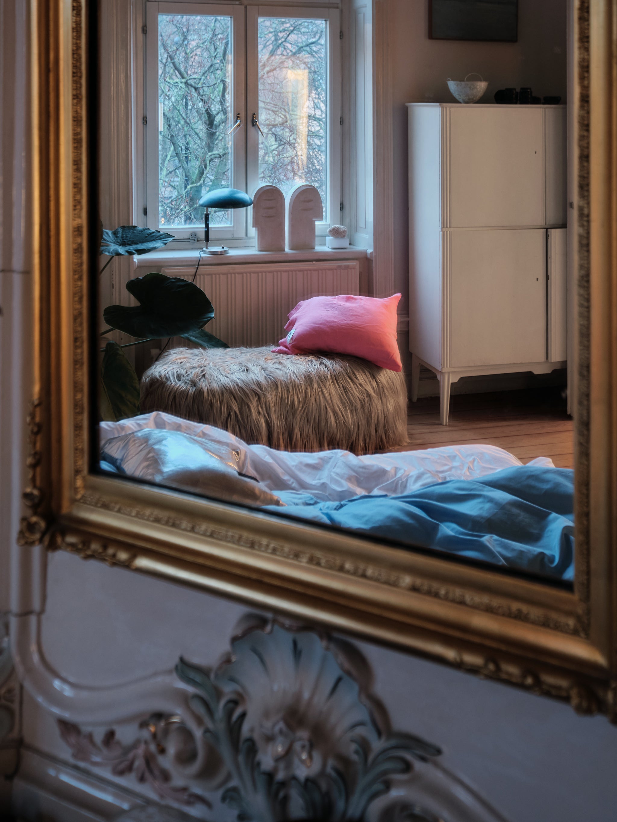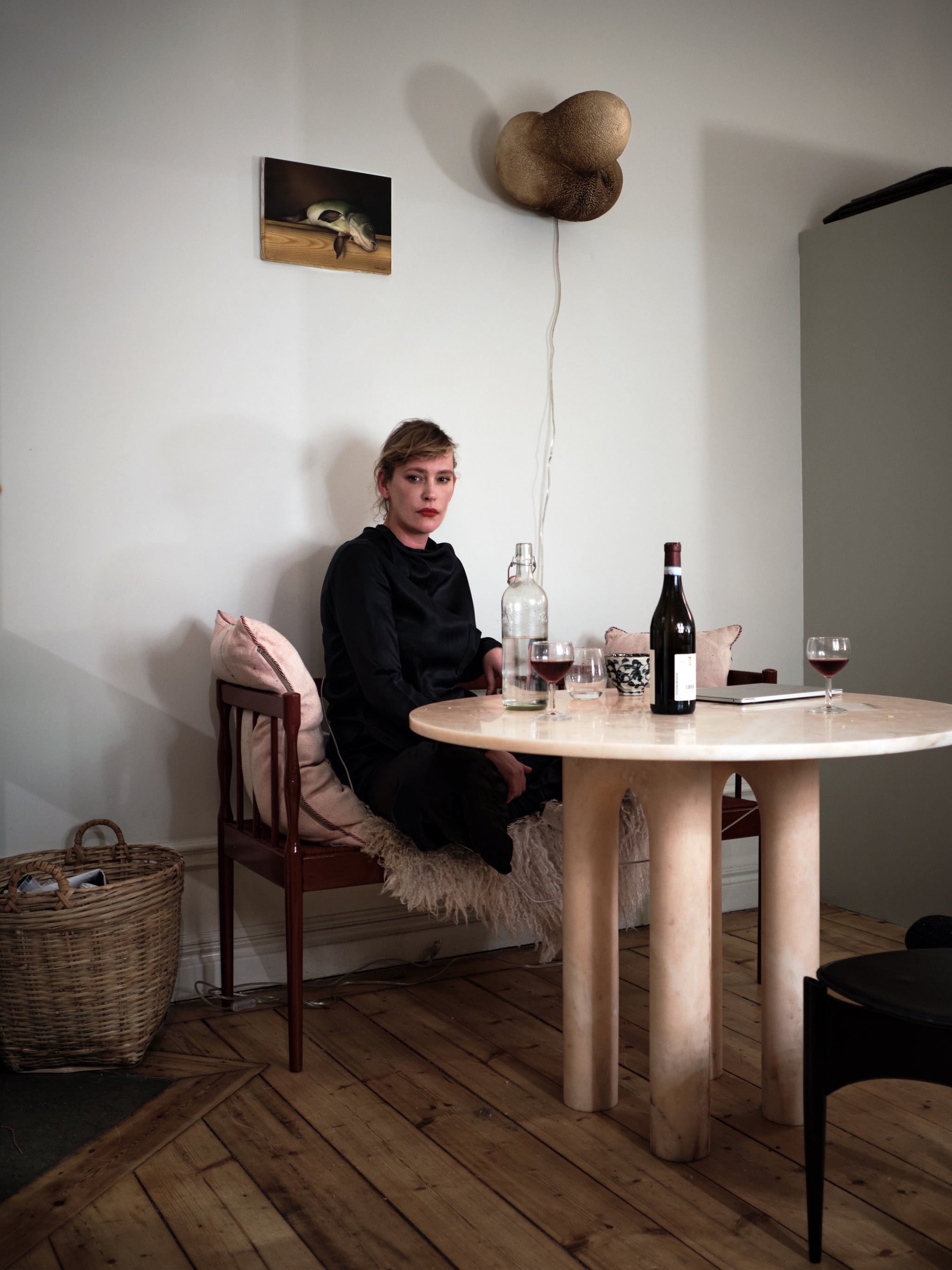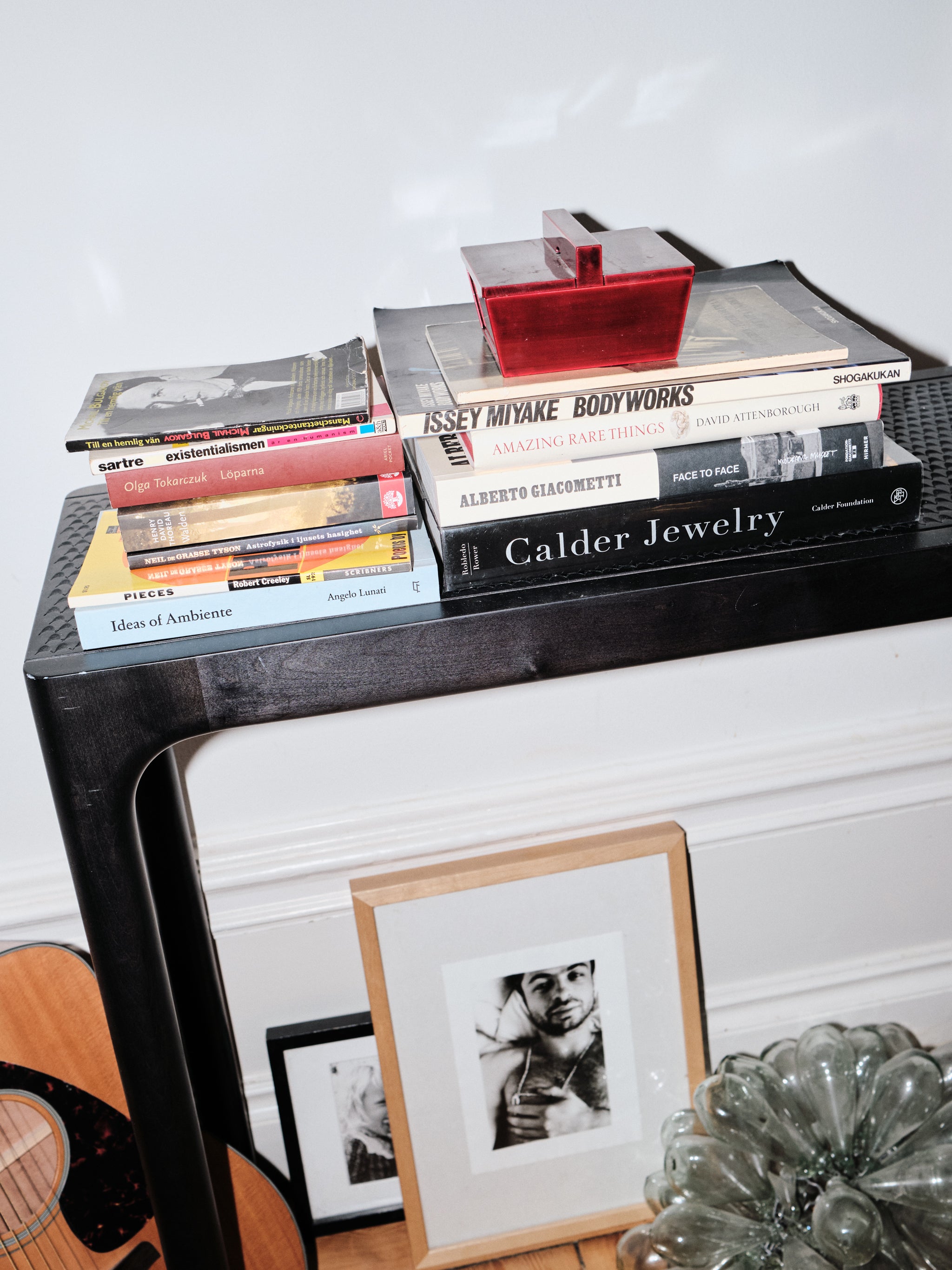 – As often as possible a fire, piles of books, a very low bed so that my dachshund can climb up and down, a hairy bench that always reminds me of rod Stewart hair, paintings in celling that I love starring at, some stuffed birds three paintings of the horizon and two works from Carsten Höller that he made from my daughter’s old pet collections of butterflies.