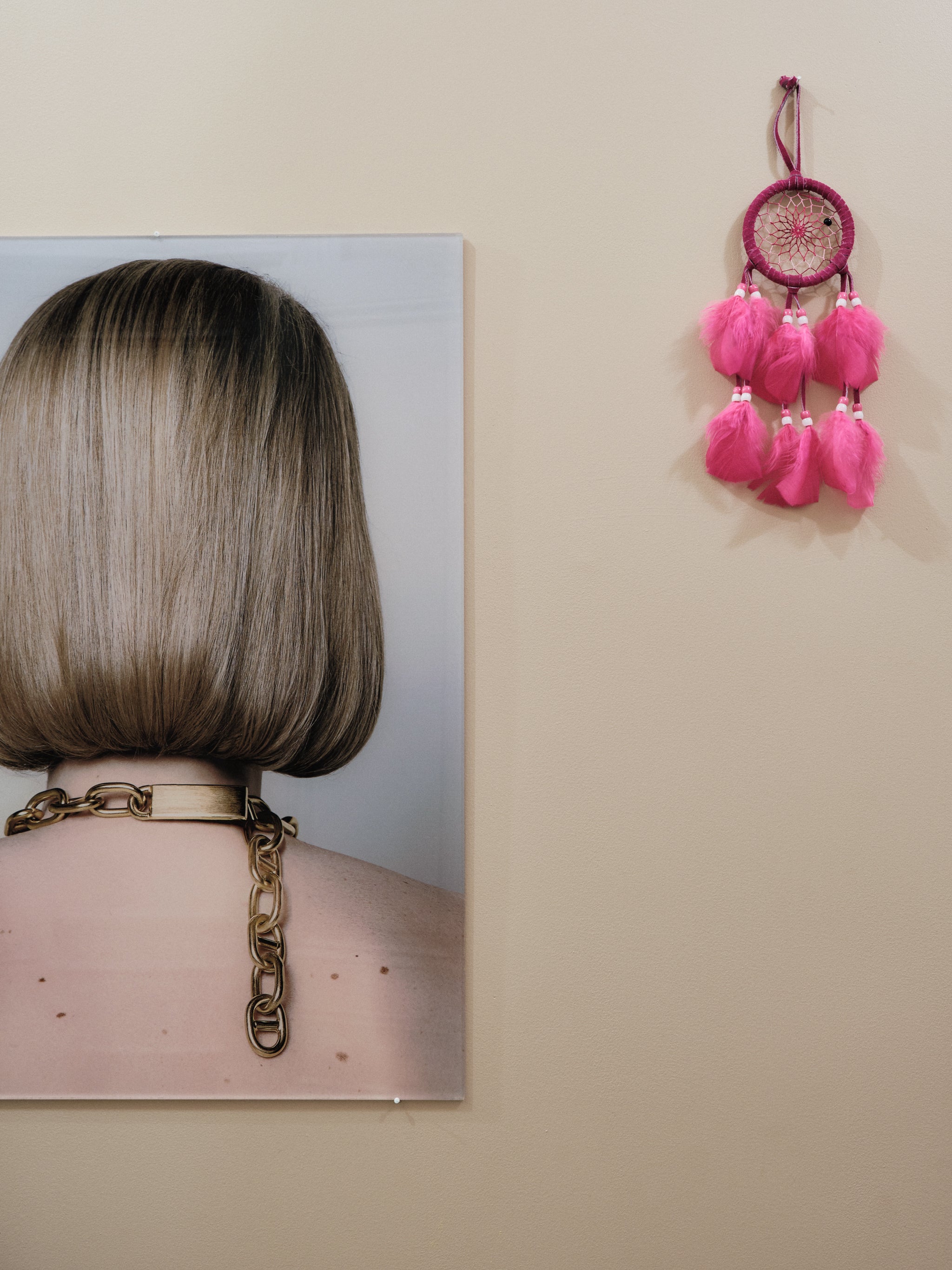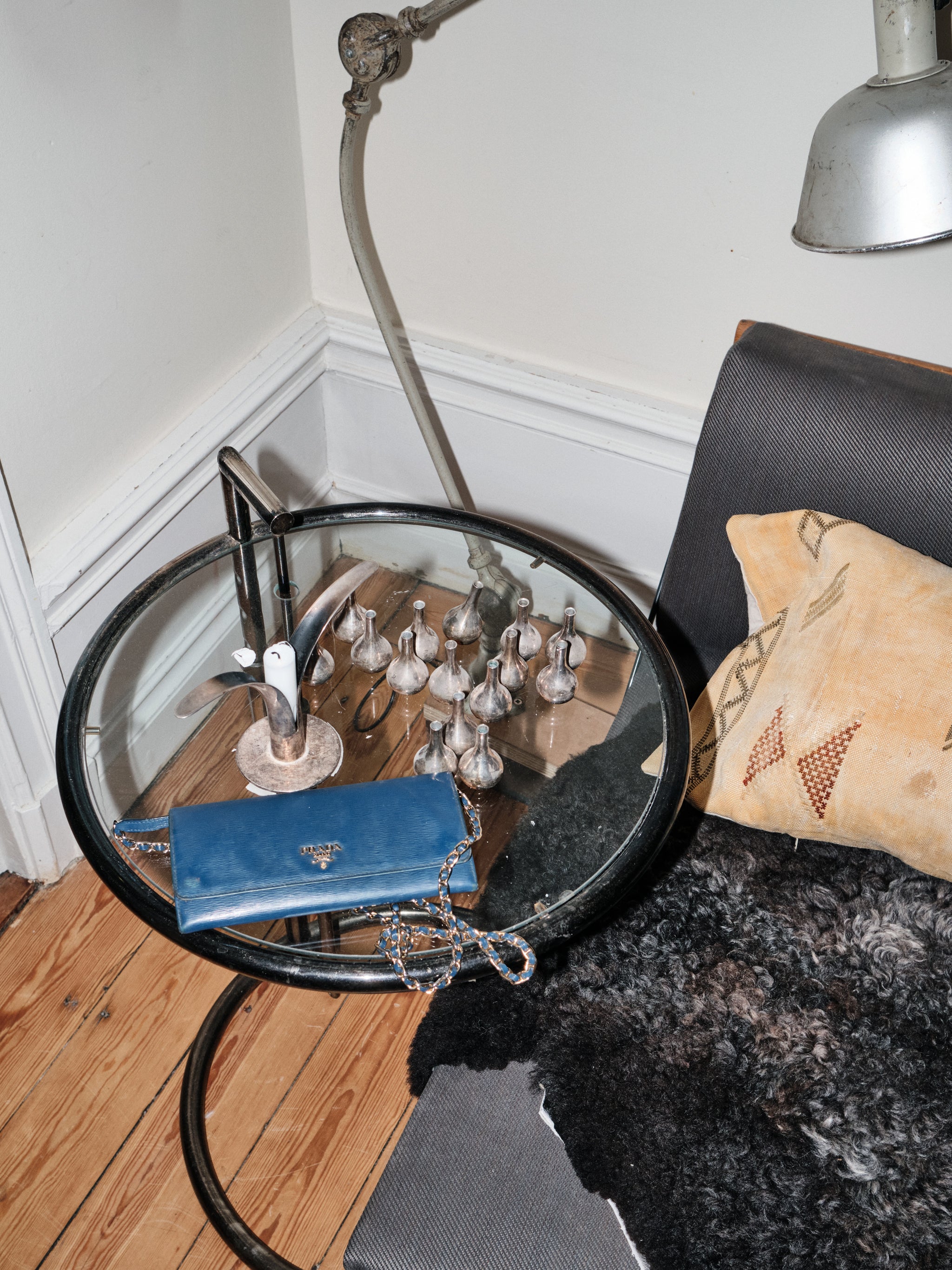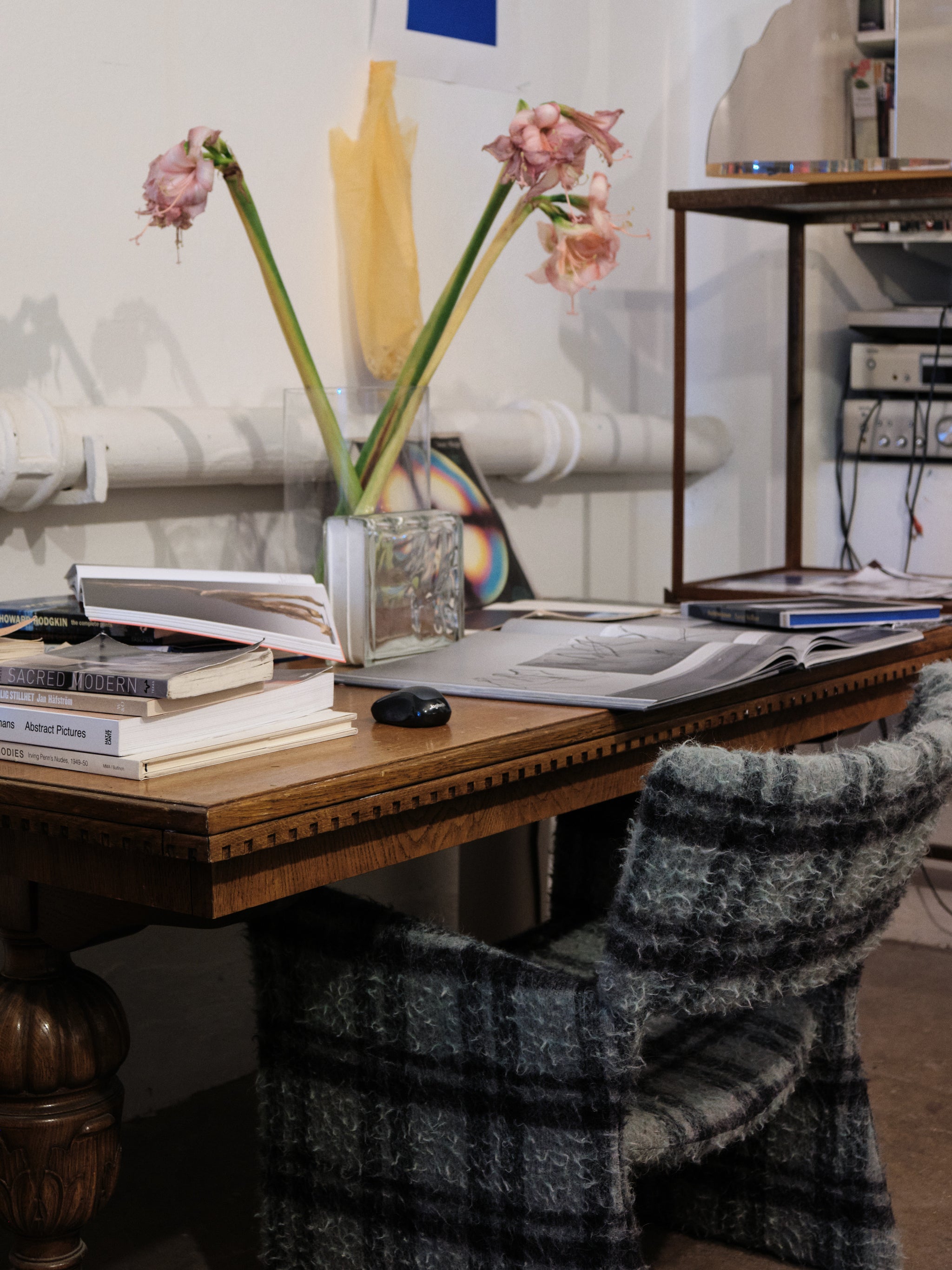 – As often as possible a fire, piles of books, a very low bed so that my dachshund can climb up and down, a hairy bench that always reminds me of rod Stewart hair, paintings in celling that I love starring at, some stuffed birds three paintings of the horizon and two works from Carsten Höller that he made from my daughter’s old pet collections of butterflies.