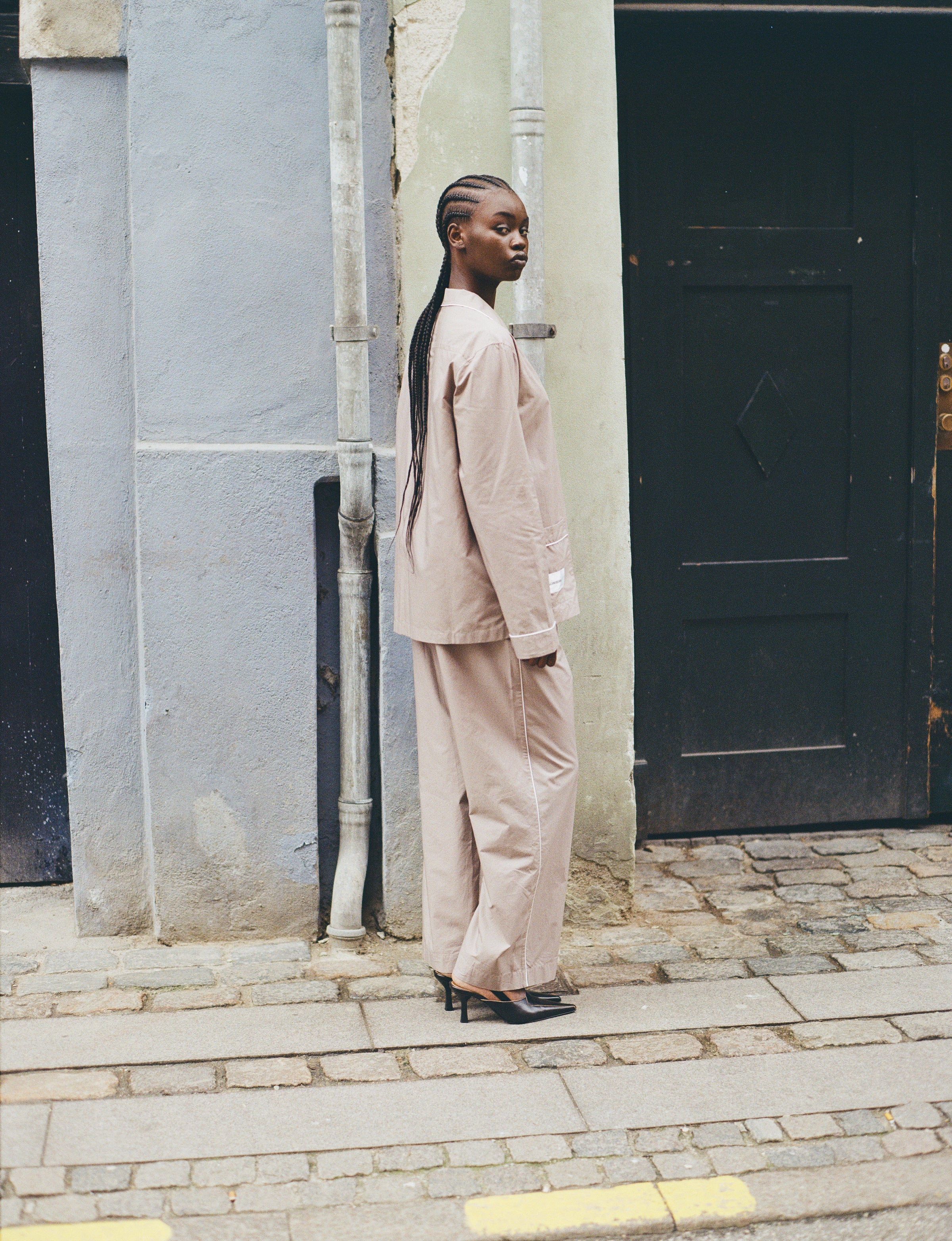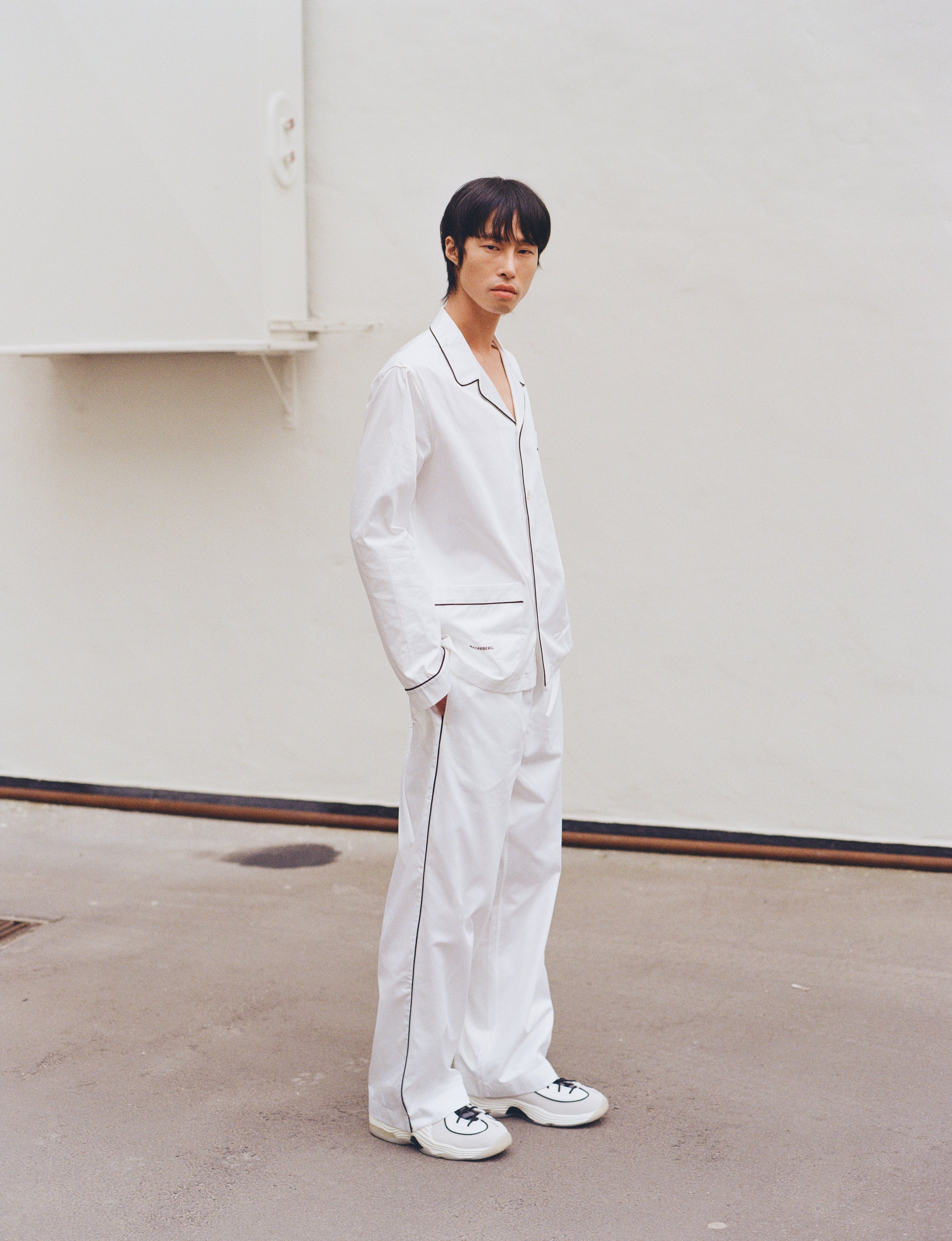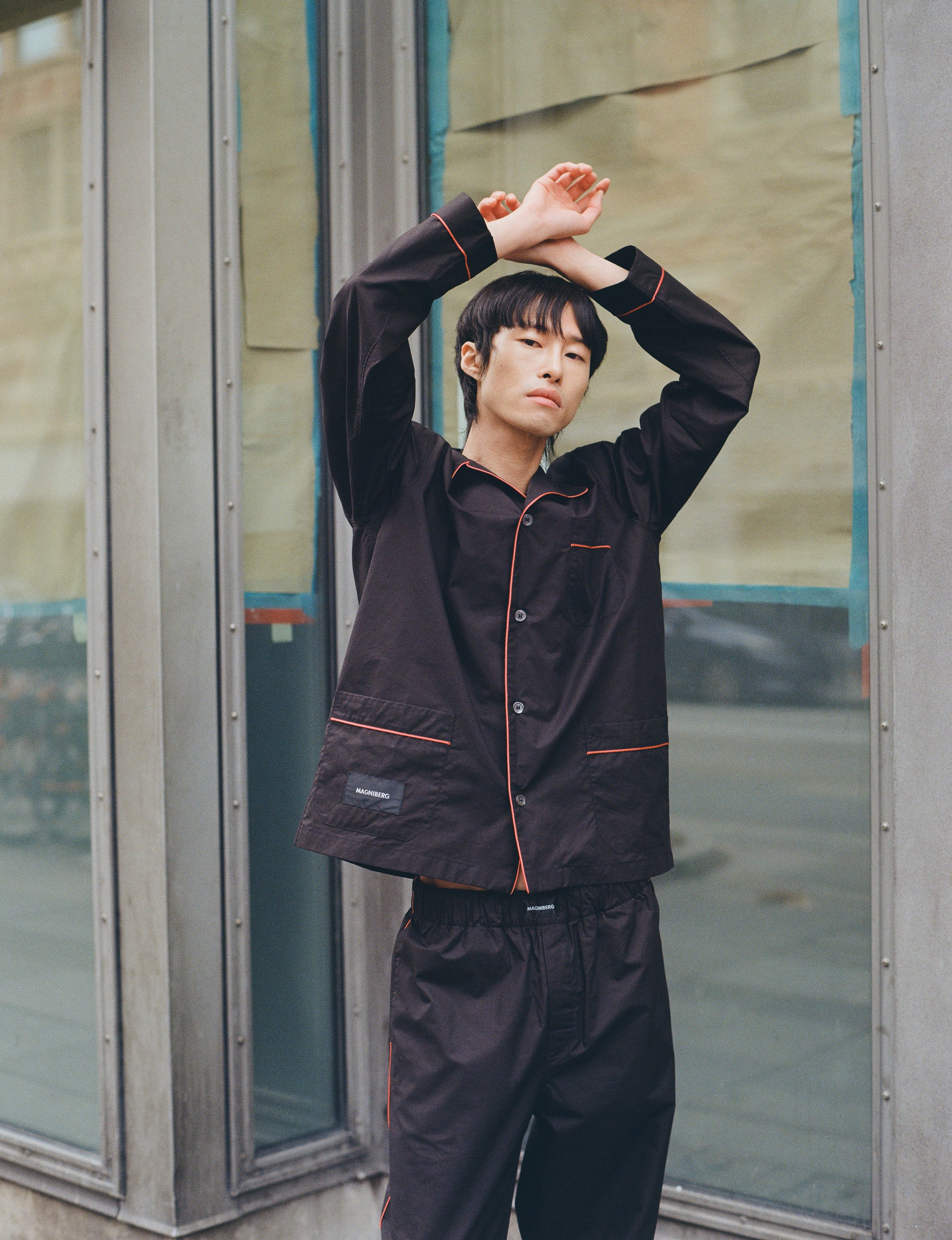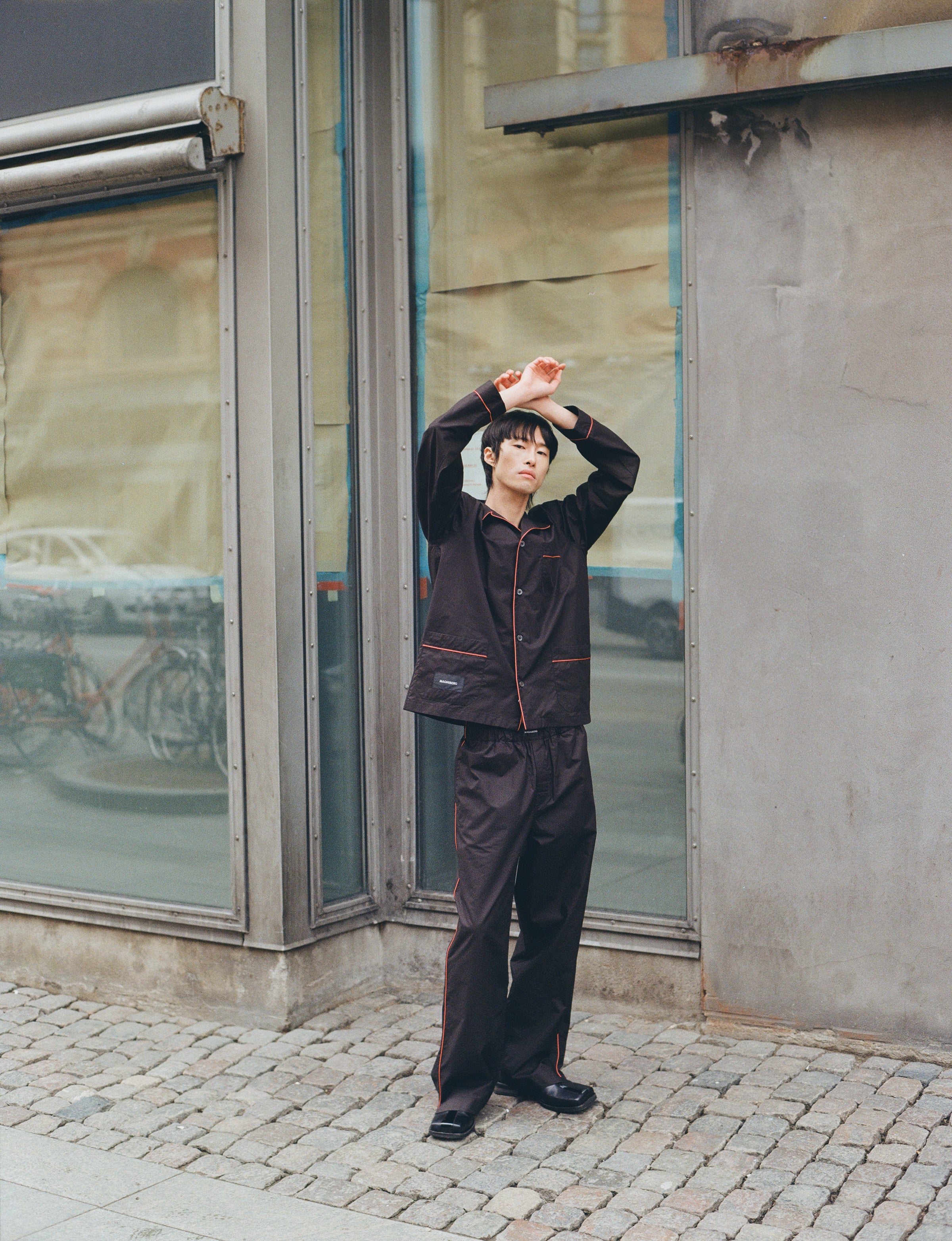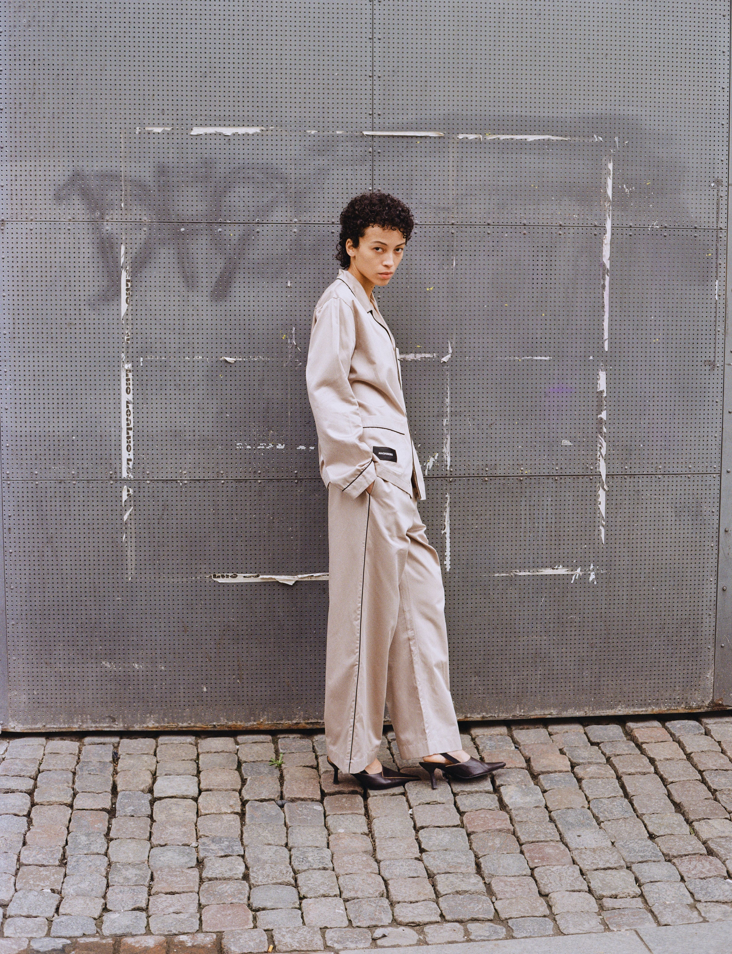 ”We draw on a lot of references from childhood, work, life, art, street culture. We approached making the Magniberg Home collection with the mindset of appraising every single thing. The fabric, the tailoring, the details. They are clearly tailored, but nicely slouchy. Meticulously made, neat and delicate. Playing with the idea of beauty, you can turn them inside out and they look just as good. We don’t talk about genders as such, rather the shape works across the sizes, you can wear them petite or go up a size. I compare it with a good shape in jeans.”