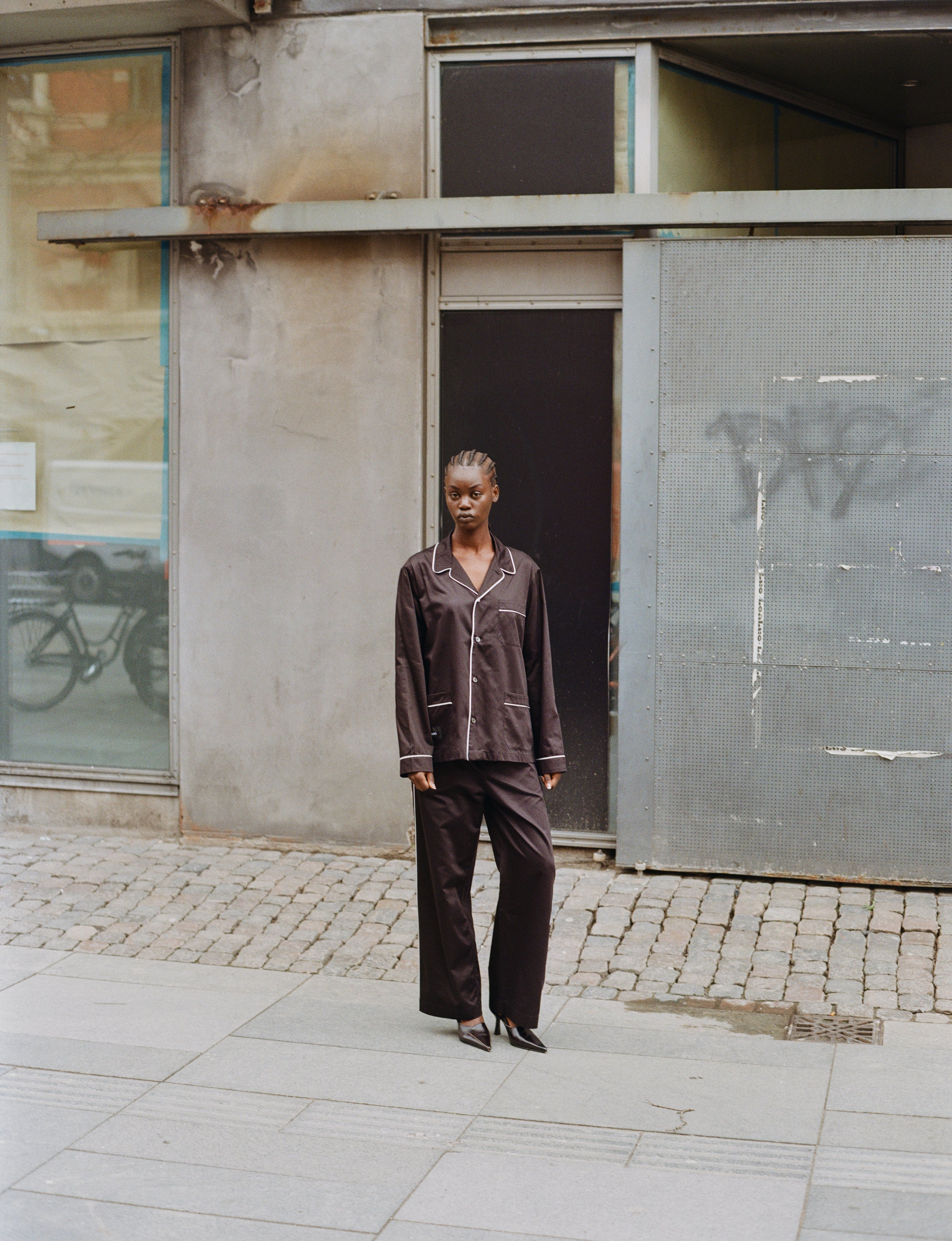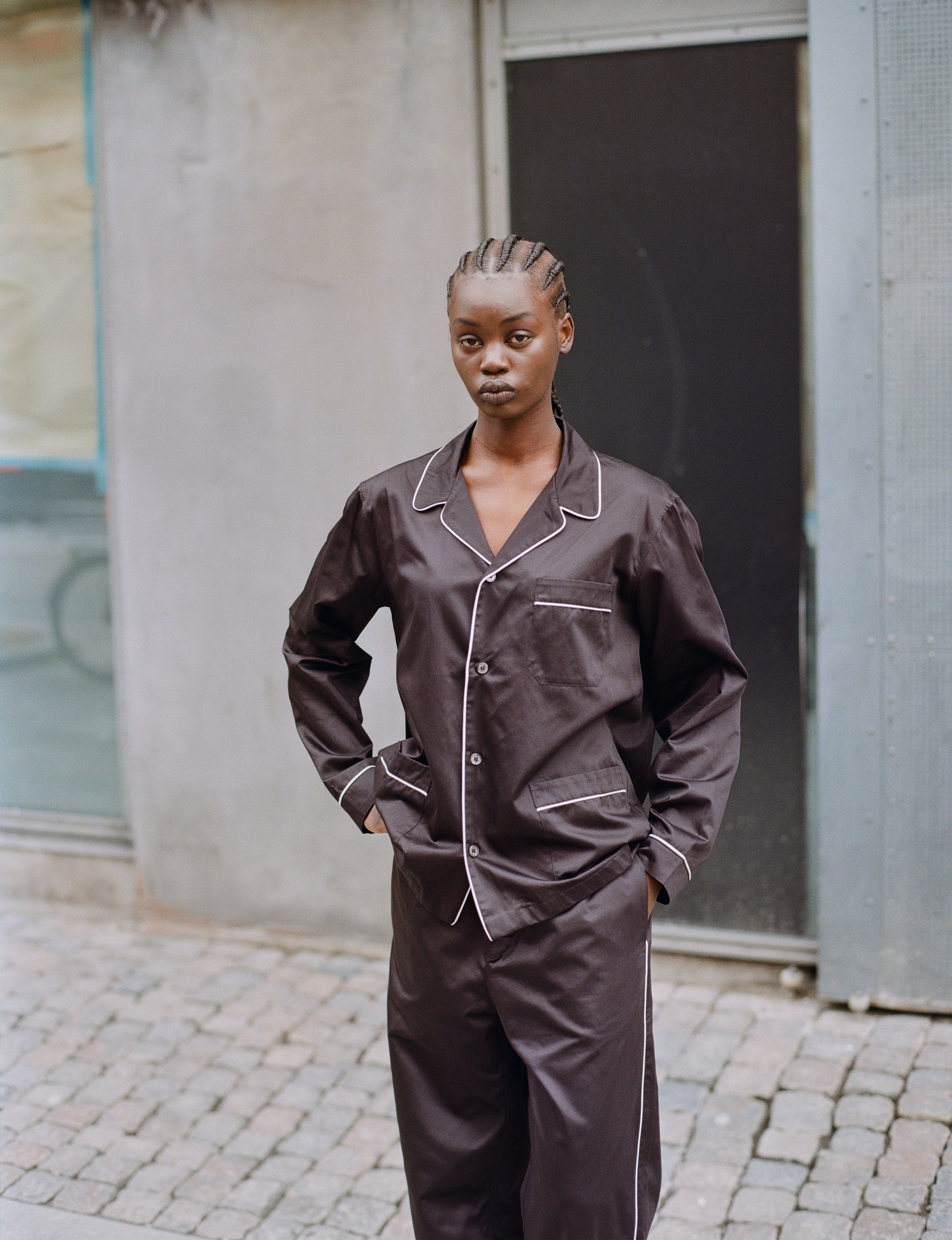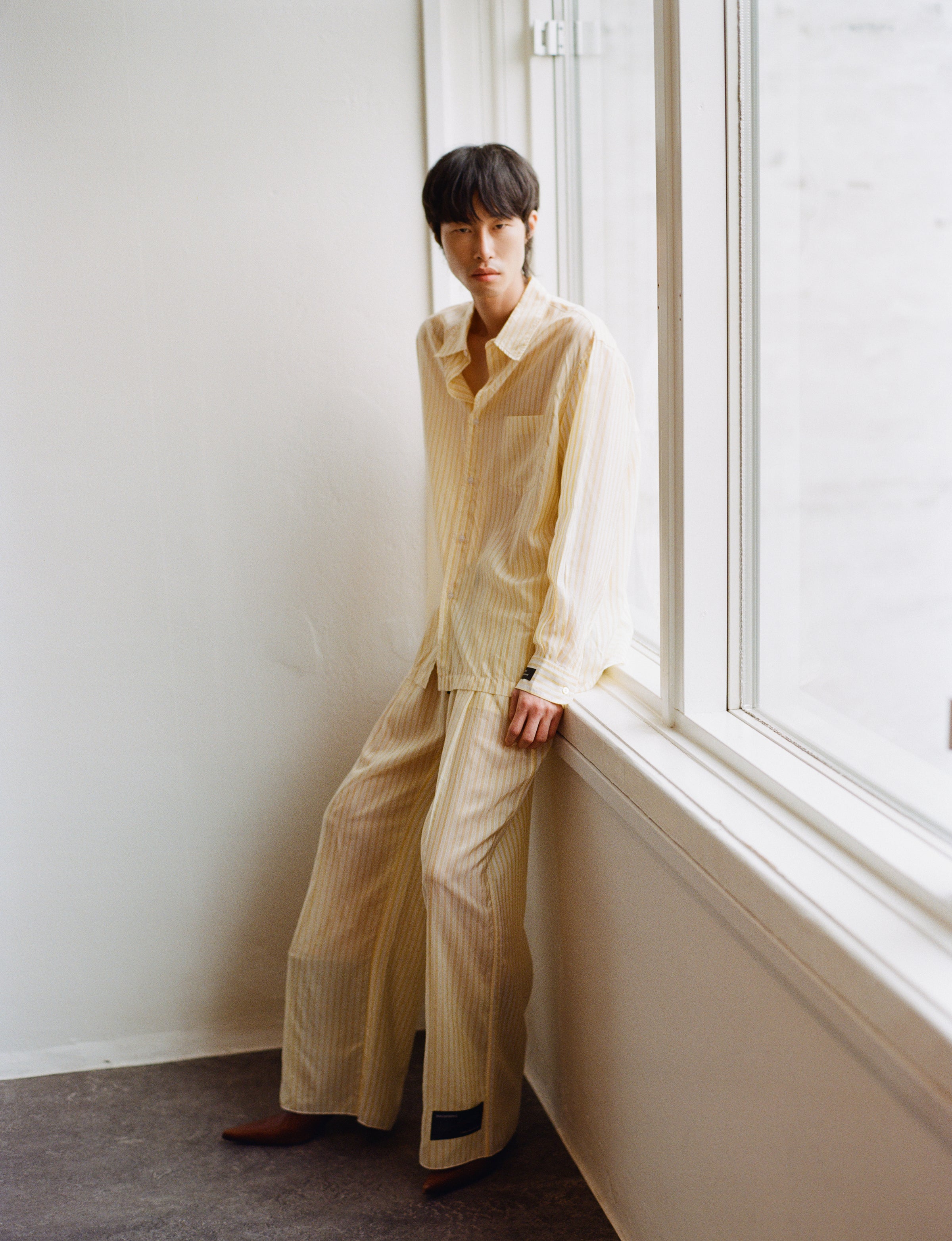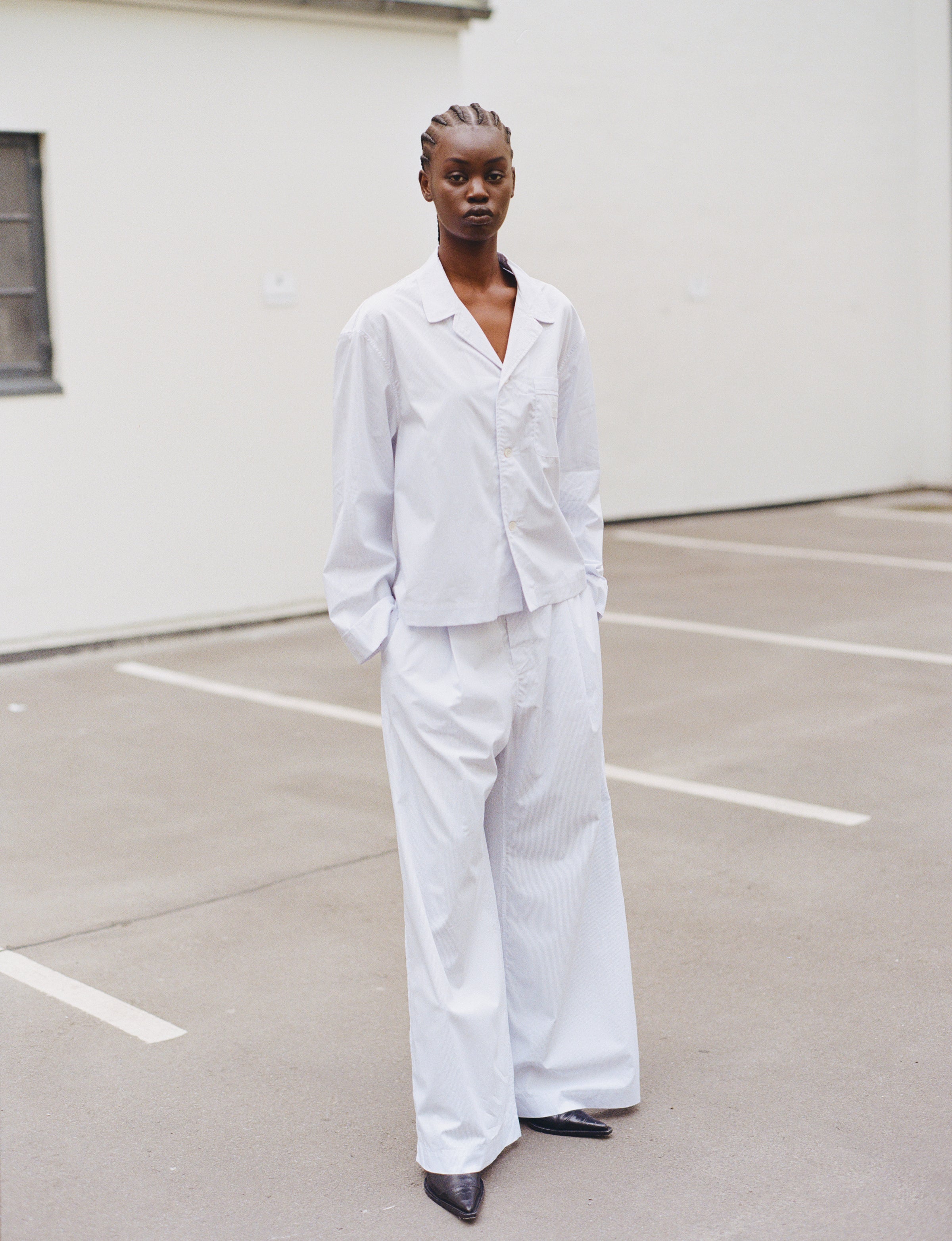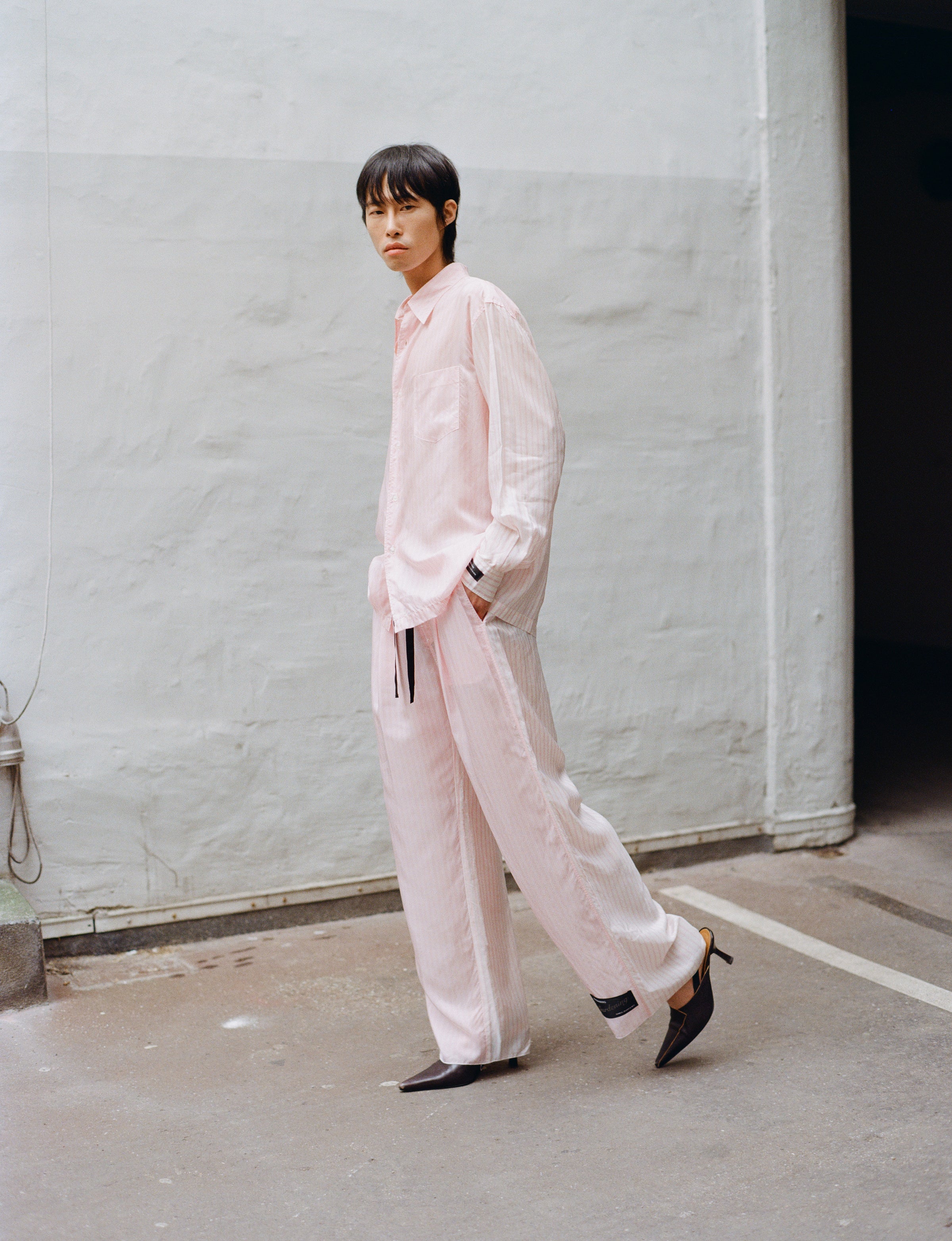 ”We draw on a lot of references from childhood, work, life, art, street culture. We approached making the Magniberg Home collection with the mindset of appraising every single thing. The fabric, the tailoring, the details. They are clearly tailored, but nicely slouchy. Meticulously made, neat and delicate. Playing with the idea of beauty, you can turn them inside out and they look just as good. We don’t talk about genders as such, rather the shape works across the sizes, you can wear them petite or go up a size. I compare it with a good shape in jeans.”