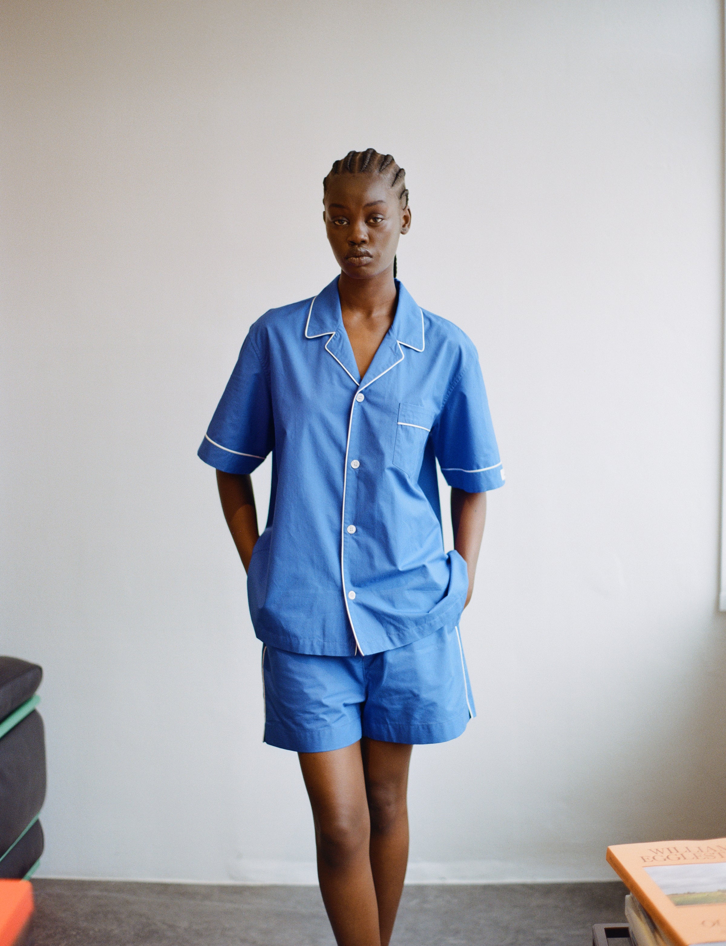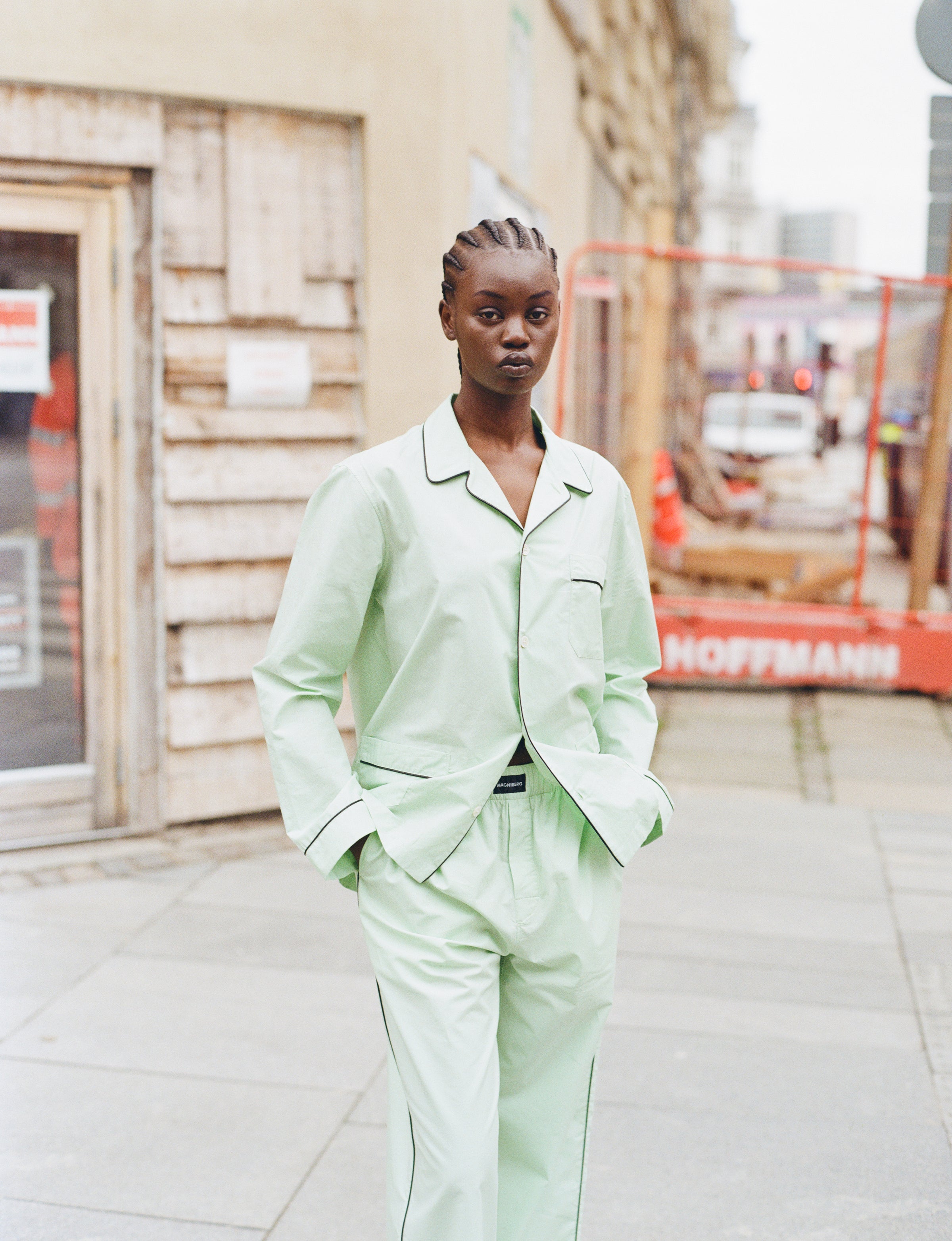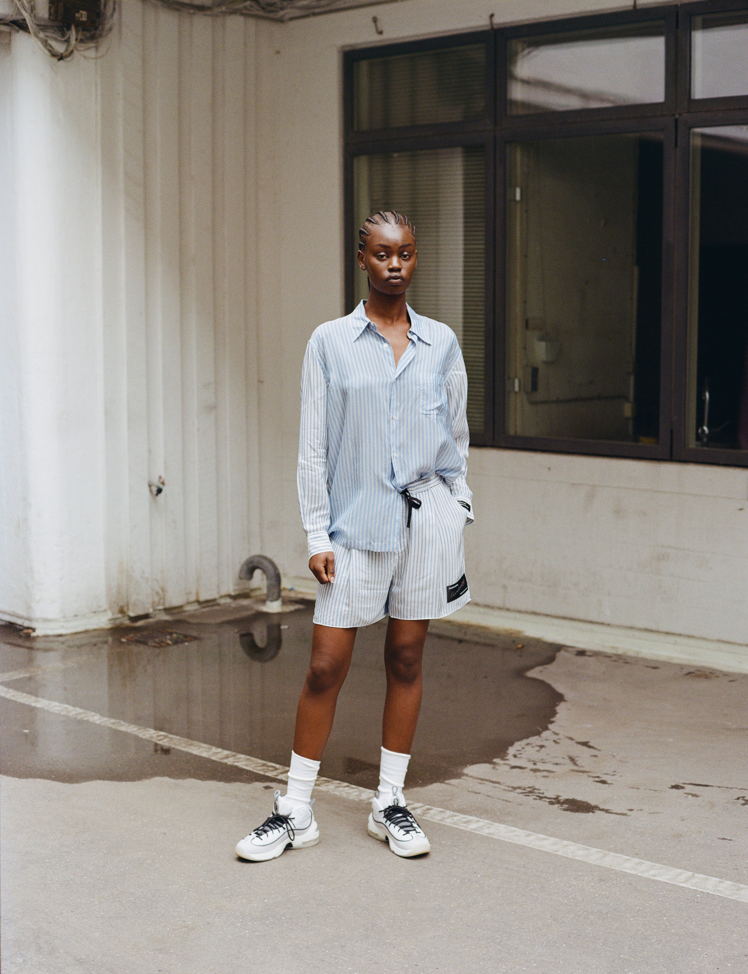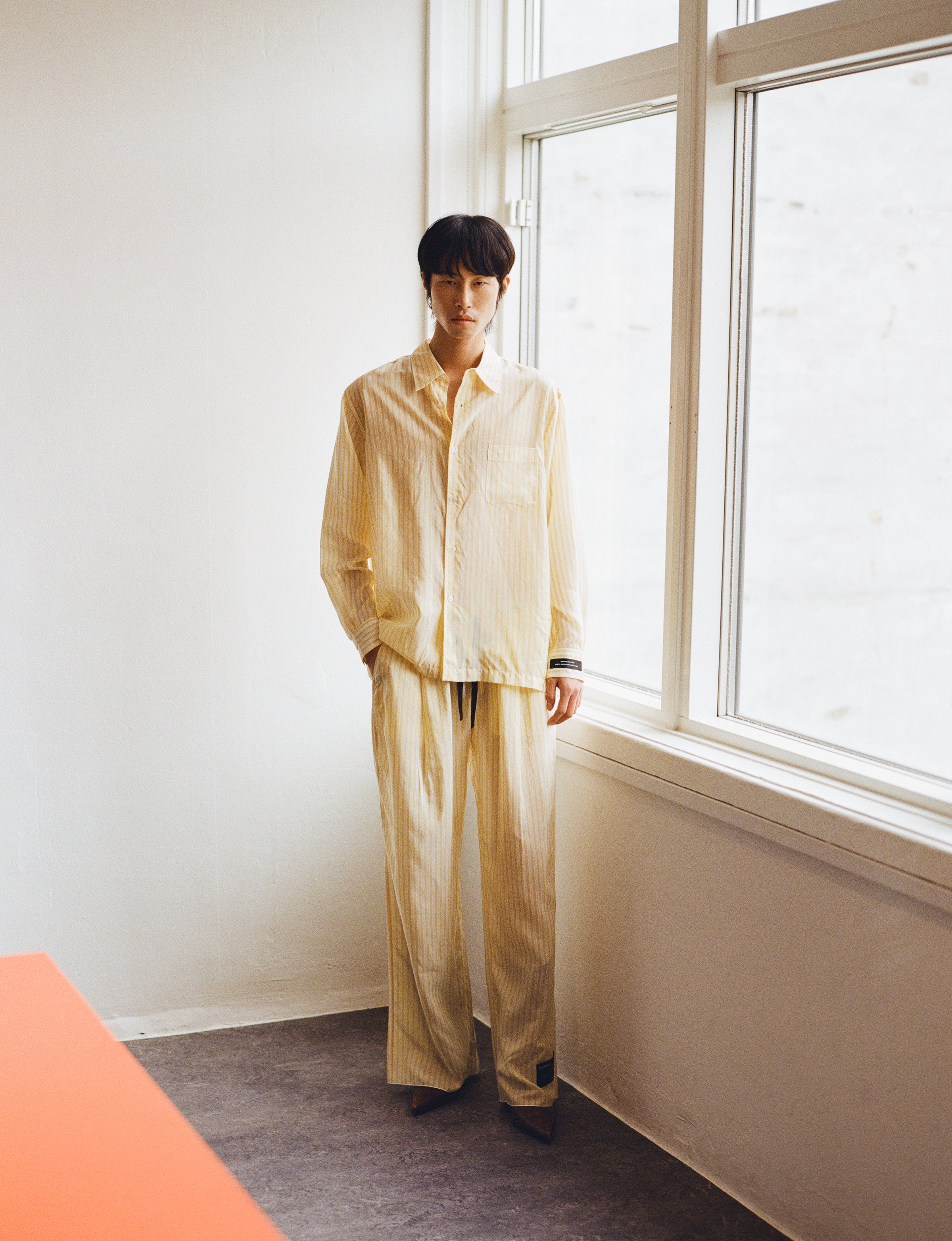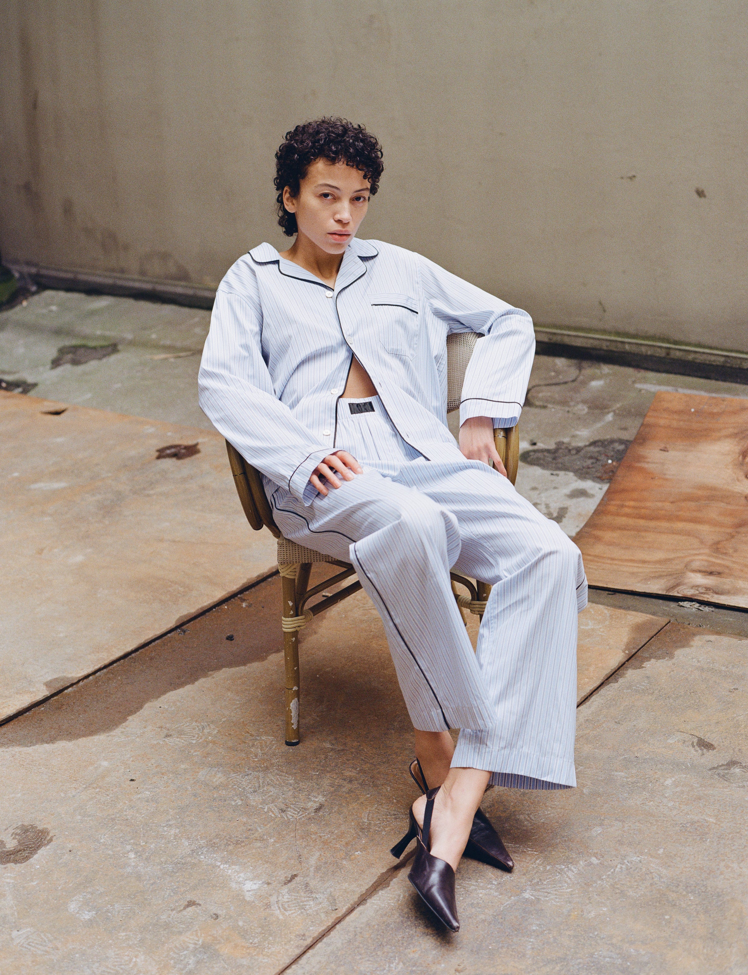 ”We draw on a lot of references from childhood, work, life, art, street culture. We approached making the Magniberg Home collection with the mindset of appraising every single thing. The fabric, the tailoring, the details. They are clearly tailored, but nicely slouchy. Meticulously made, neat and delicate. Playing with the idea of beauty, you can turn them inside out and they look just as good. We don’t talk about genders as such, rather the shape works across the sizes, you can wear them petite or go up a size. I compare it with a good shape in jeans.”
