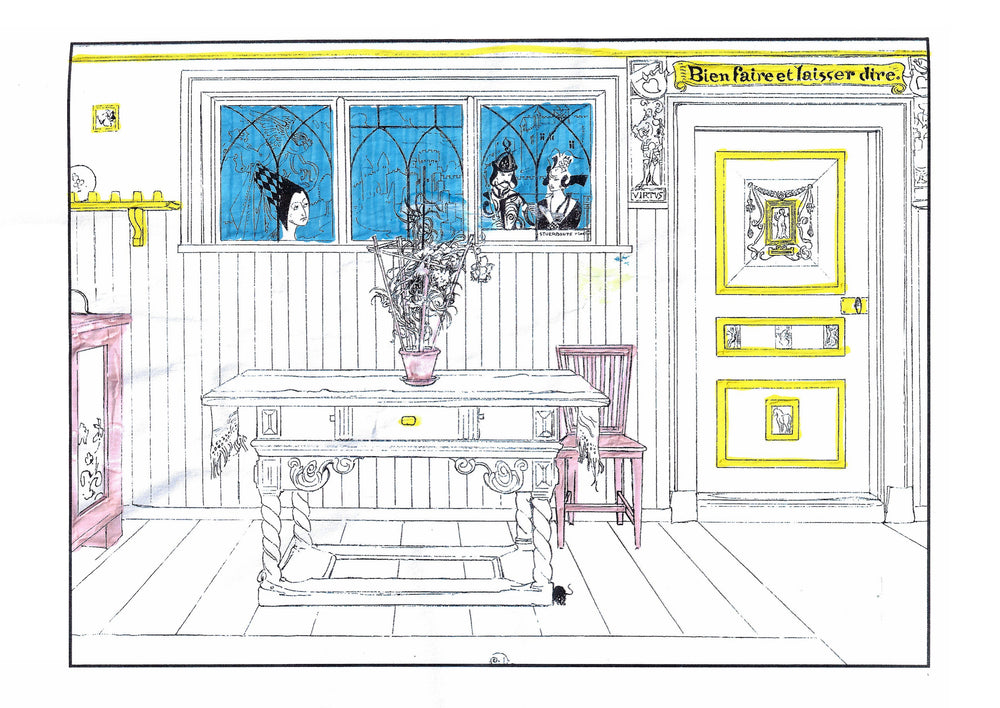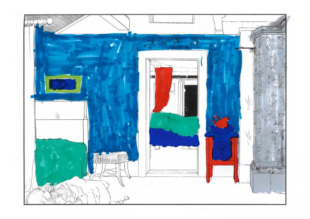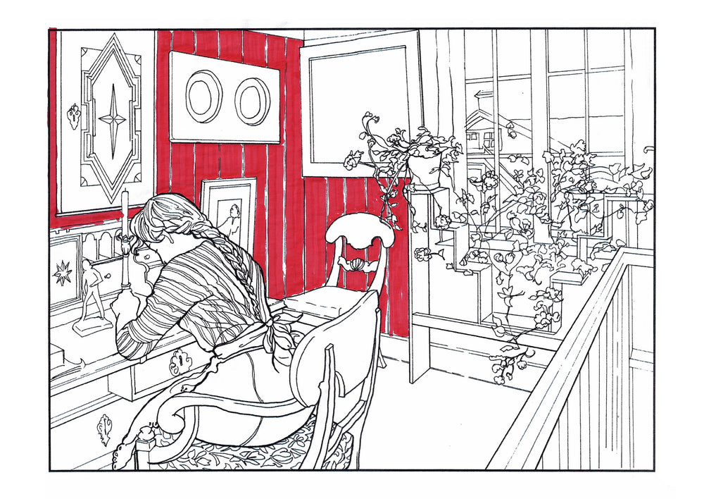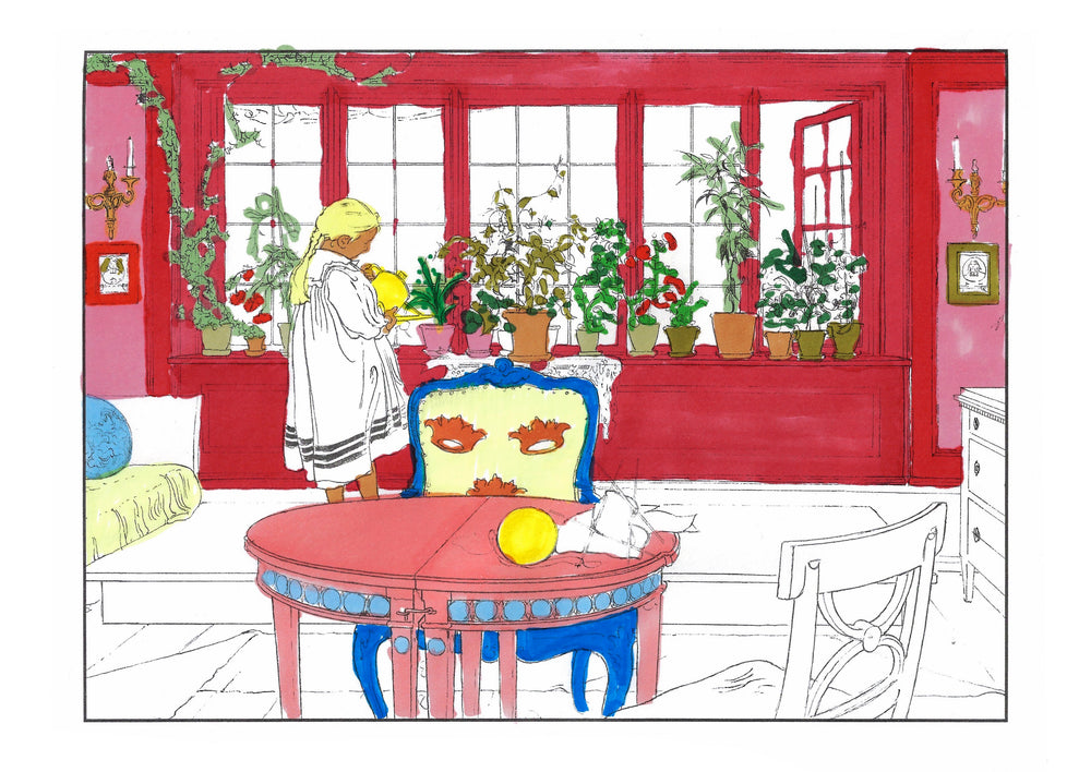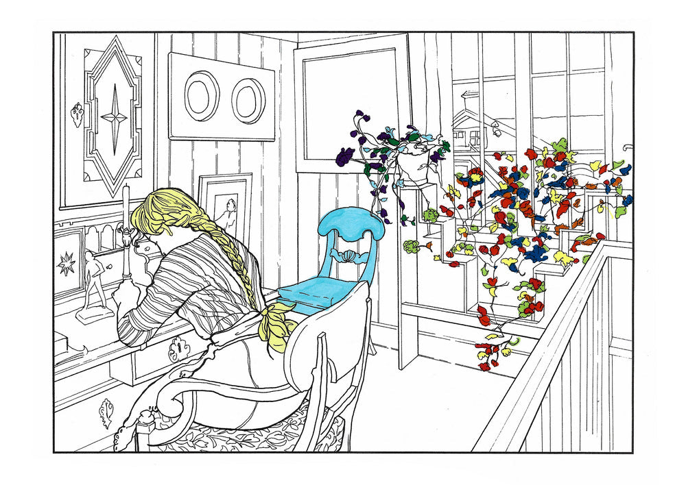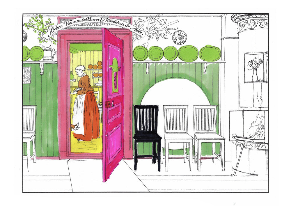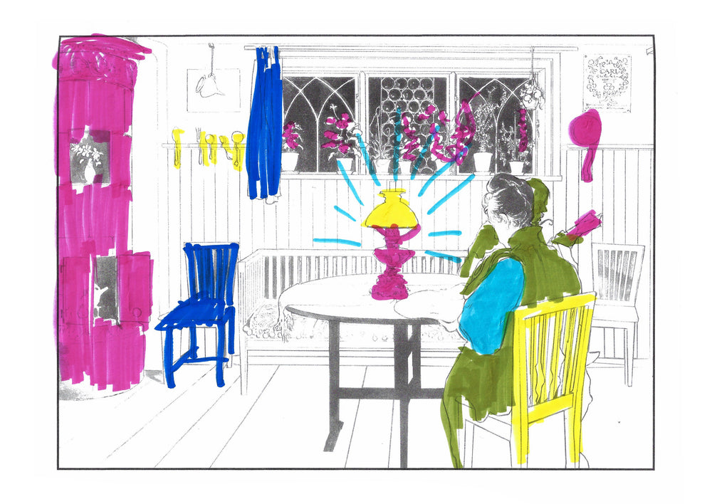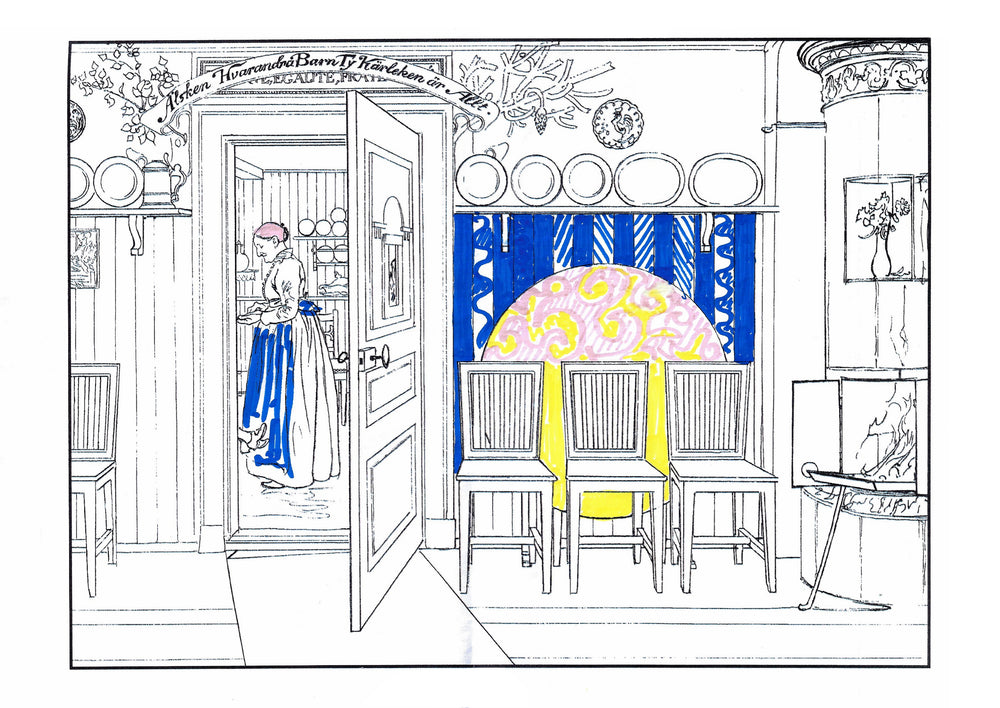 The colouring book features pictures by the late-19th-century Swedish artist Carl Larsson. Magniberg founders Bengt Thornefors and Nina Norgren have always taken inspiration from the life and work of Larsson and his wife Karin - an artist and early interior decorator who filled the family's cottage with flowers, books and painted furniture she designed. Which is how Laird arrived one afternoon a couple of years ago, the colouring book tucked under her arm, a thoughtful gift from a friend.