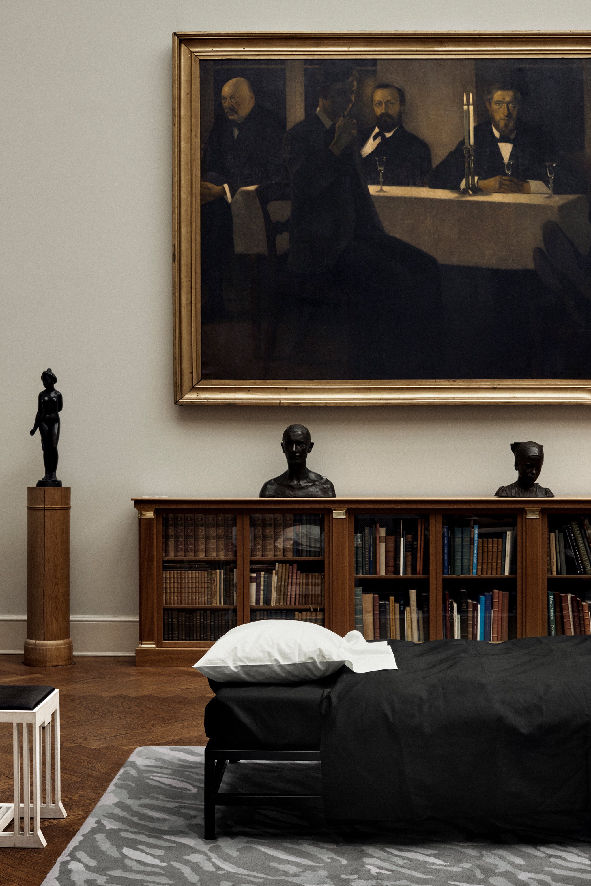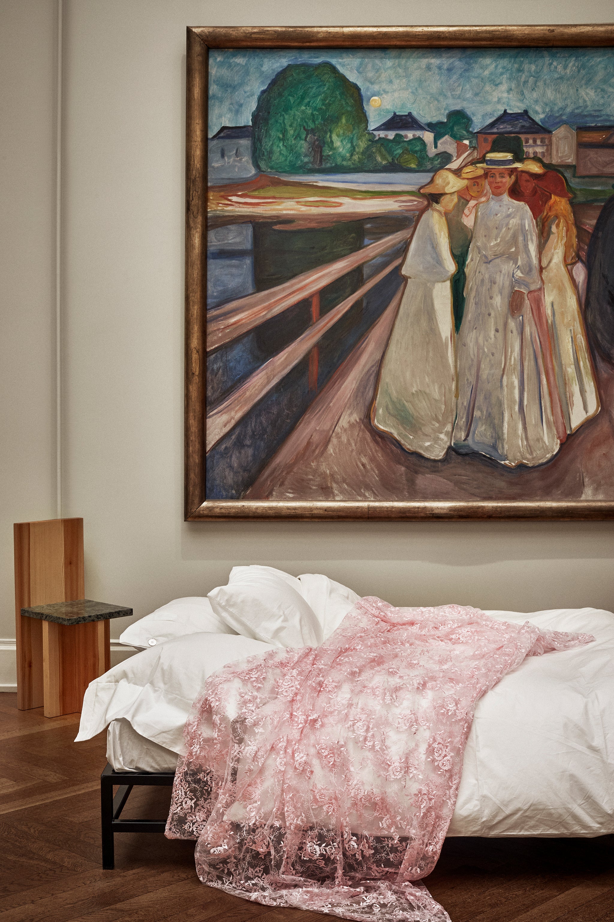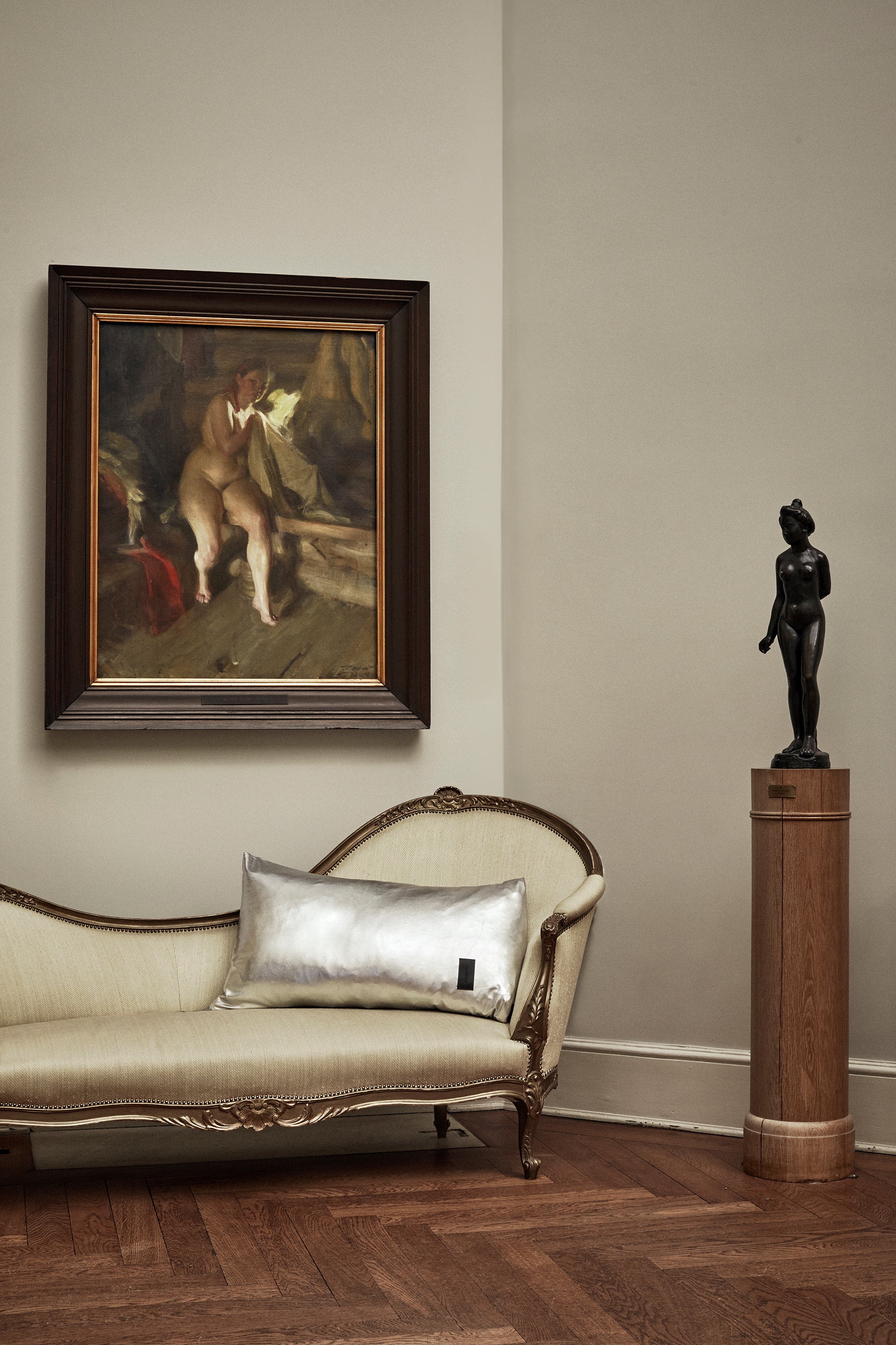 Depicting the bedwear of Magniberg in the scenic spaces of The Thiel Gallery in Stockholm, Sweden, the editorial series juxtaposes Magniberg’s emotionally contemporary designs with artworks of Scandinavian masters that include August Strindberg, Edvard Munch, Anders Zorn, Vilhelm Hammershøi, Eugéne Jansson and more alongside antique interior pieces by Axel Einar-Hjorth, Gustaf Fjaestad, Josef Hoffmann and Astrid Ericsson.
